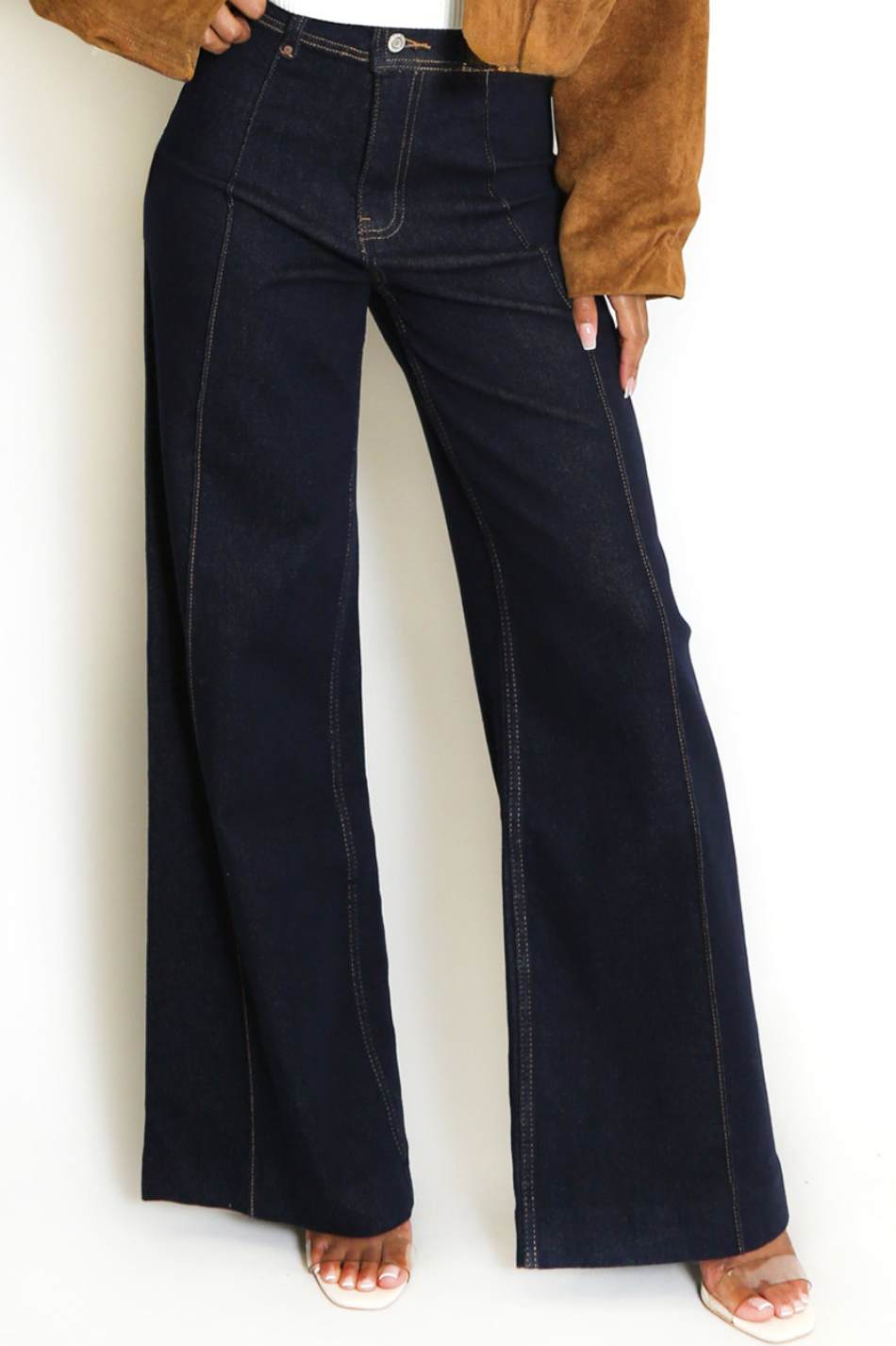 High waisted dark denim jeans with flattering front stitch seam down the centre of each leg which elongates your legs. Wide leg fit with sticked pockets on the reverse.