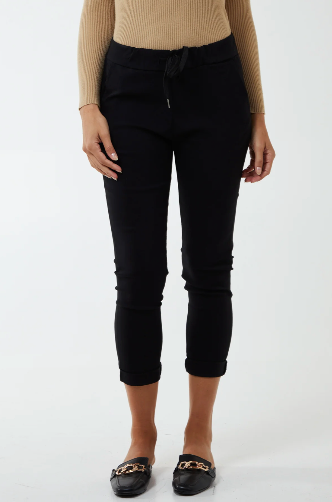 Drawstring fastening, the magic is the super stretch flattering fabric. Turn up hems for a cropped look or wear full length.